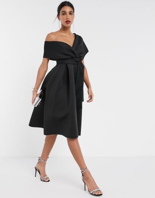 Asos Design Fallen Shoulder Midi Prom Dress With Tie Detail In Black